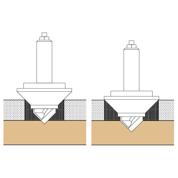 Tajemnica tkwi w 3D Bit Carver Router i sposób w jaki współdziała z szablonami. Frez w kształcie litery V jest umieszczony w kołnierzu prowadzącym w kształcie stożka 45°.