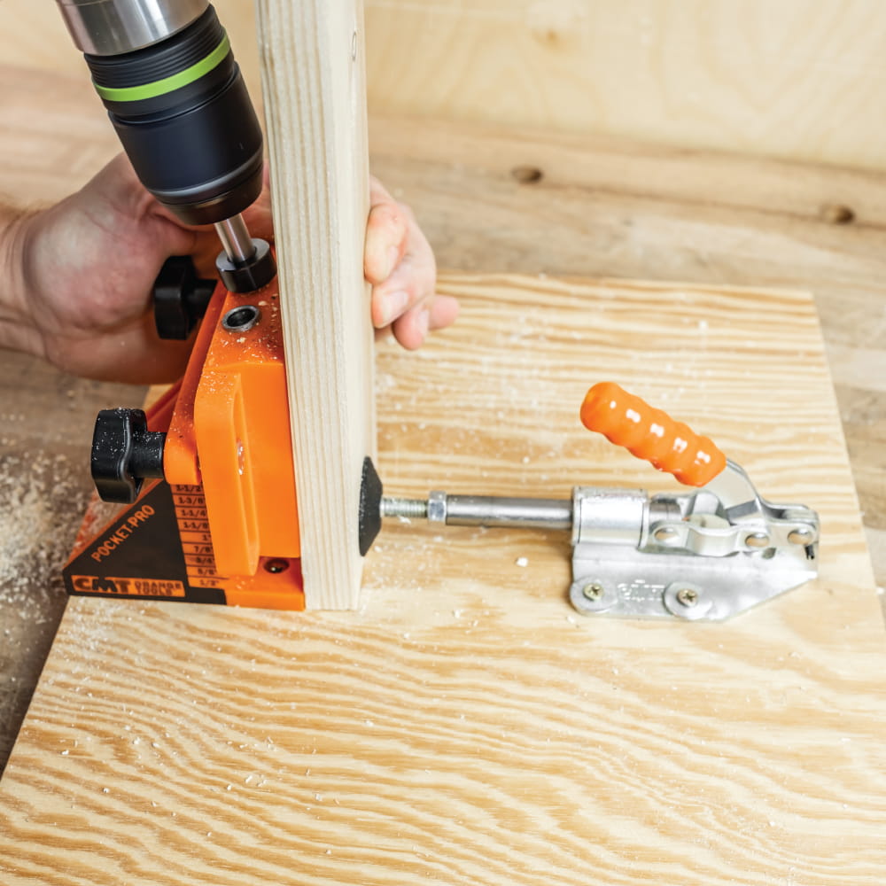 Z System Pocket-Pro nie ma takiego problemu. Możliwość regulacji uchwytu góra – dół, pozwala Ci na łatwą i szybką zmianę grubości obrabianego materiału, począwszy od 12,7mm do 40mm, regulując co 1,6mm. Aby zmienić styl połączenia, konieczna była zmiana pozycji ogranicznika głębokości wiercenia. System Pocket-Pro umożliwia dokonywania rożnych regulacji, bez zmiany pozycji ogranicznika.