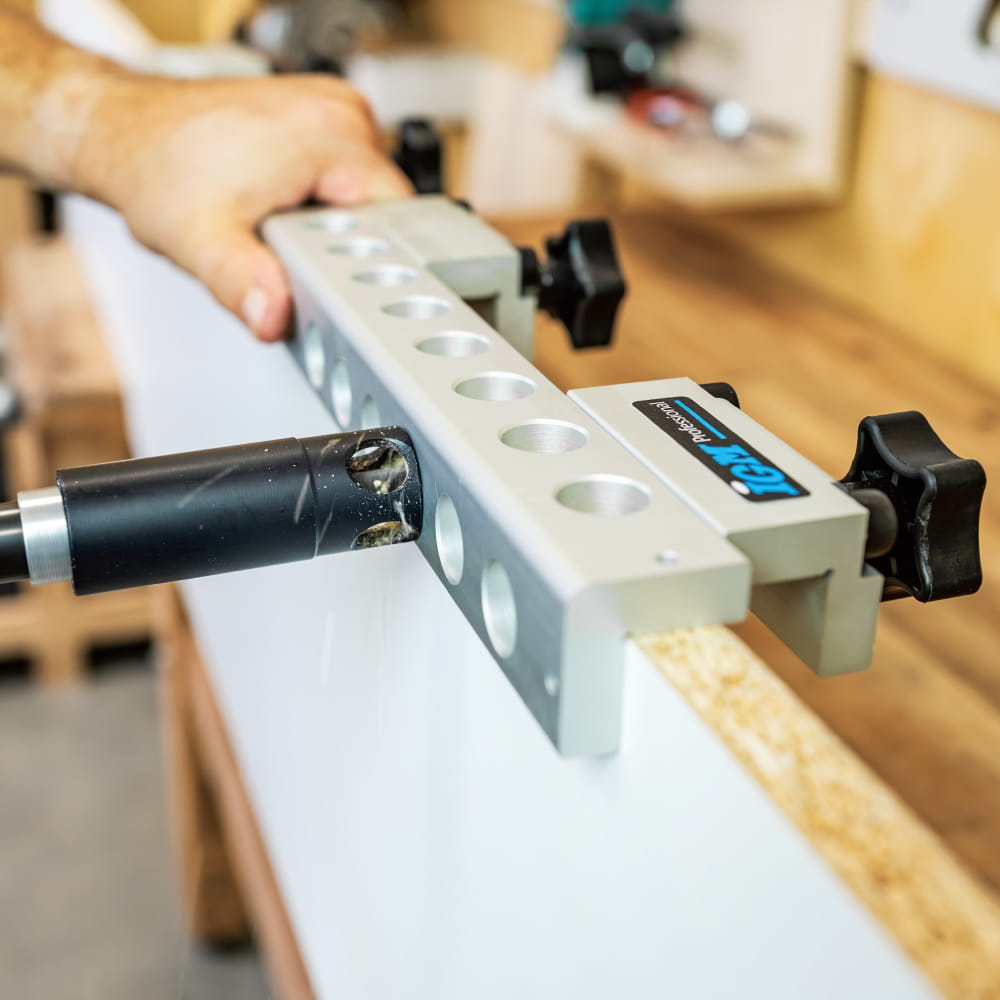 Urządzenie do wiercenia wytwarza dokładne połączenie narożnikowe ze skosem 0,5mm. Ograniczniki końcowe zapewniają wyrównanie łączonych elementów z przedniej lub tylnej strony.