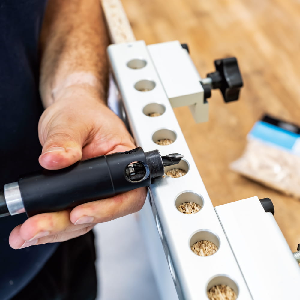 Istnieje możliwość przymocowania do urządzenia materiału o szerokości od 18mm do 45mm, co można docenić zwłaszcza w przypadku pracy z masywnym drewnem.Centralna część otworów znajduje się w odległości 9mm od wewnętrznej krawędzi urządzenia. Unikalne wrzeciono wiertarskie umożliwia stosowanie HM wierteł dyblujących o średnicach od 3mm do 12mm. Dzięki łatwej zmianie średnicy wiertła można w prosty sposób wykonywać otwory nie tylko pod kołki, ale również pod konfirmaty, uchwyty, NK zawiasy, wsporniki półek ,pod wkręty oraz euro śruby.