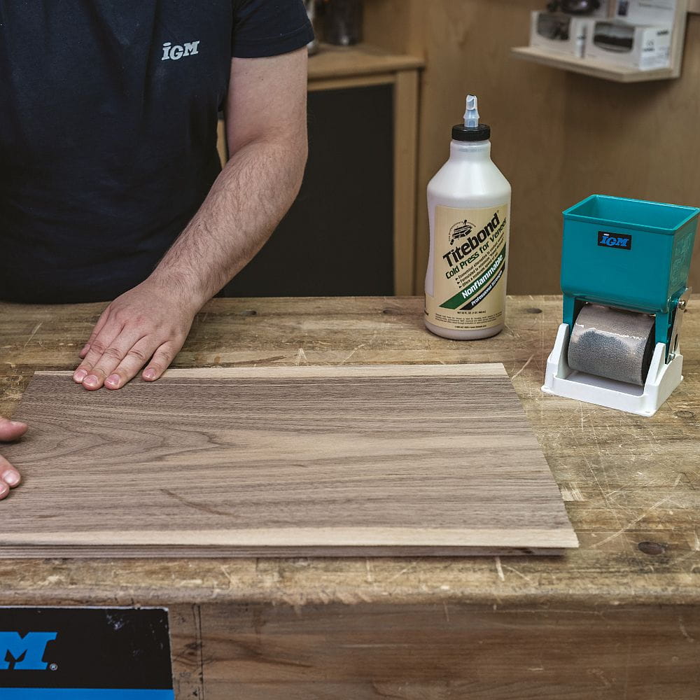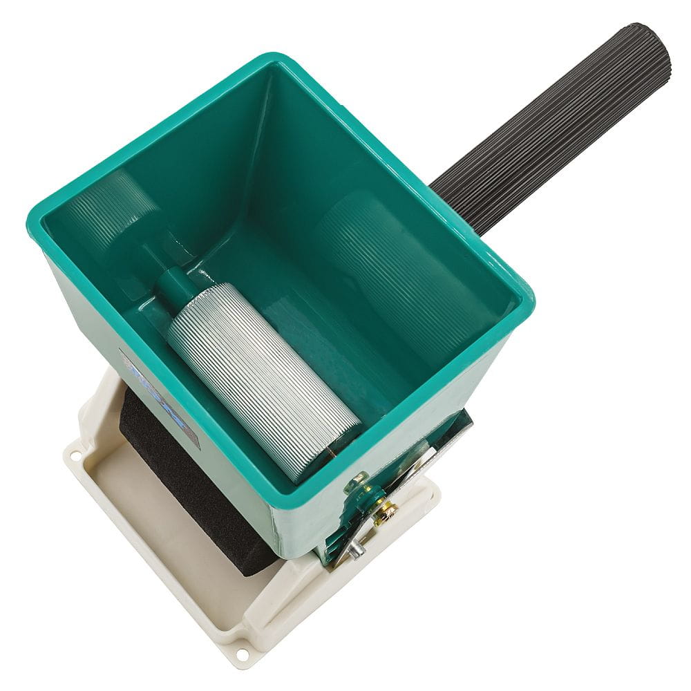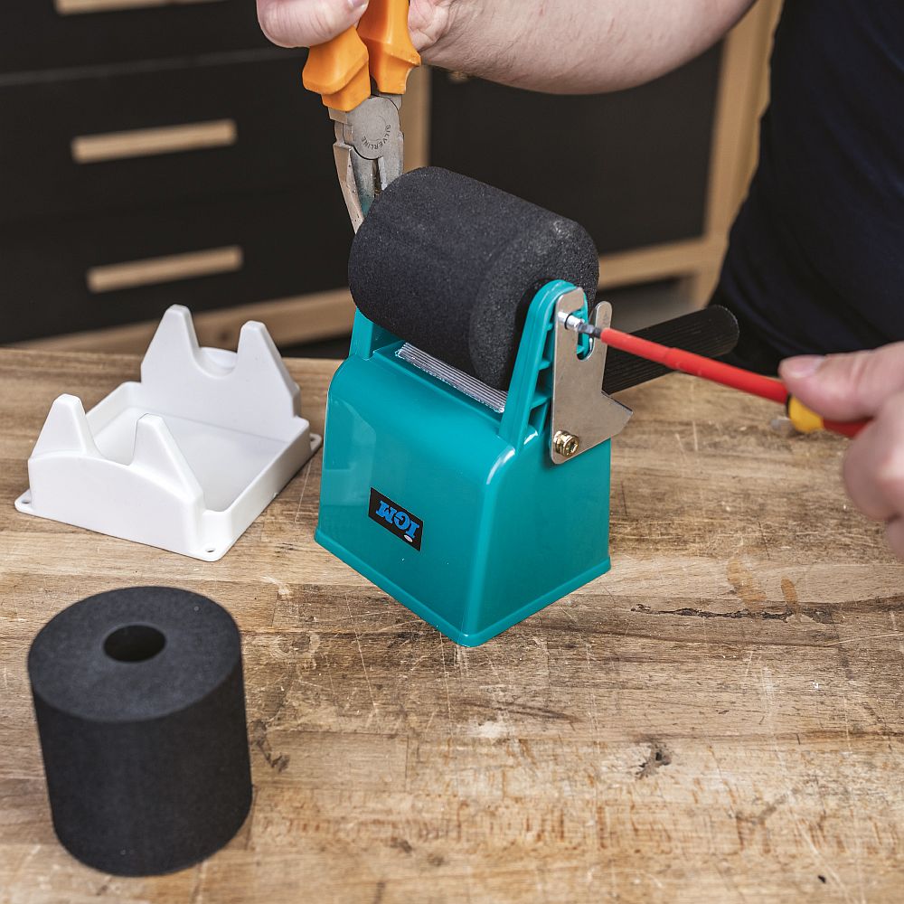 Wyjmij nową rolkę z pojemnika. Przykręć uchwyt do pojemnika. Wlej klej dyspersyjny do wanienki.