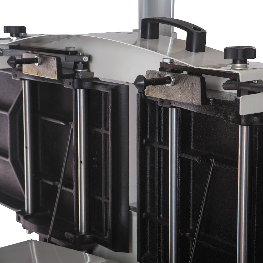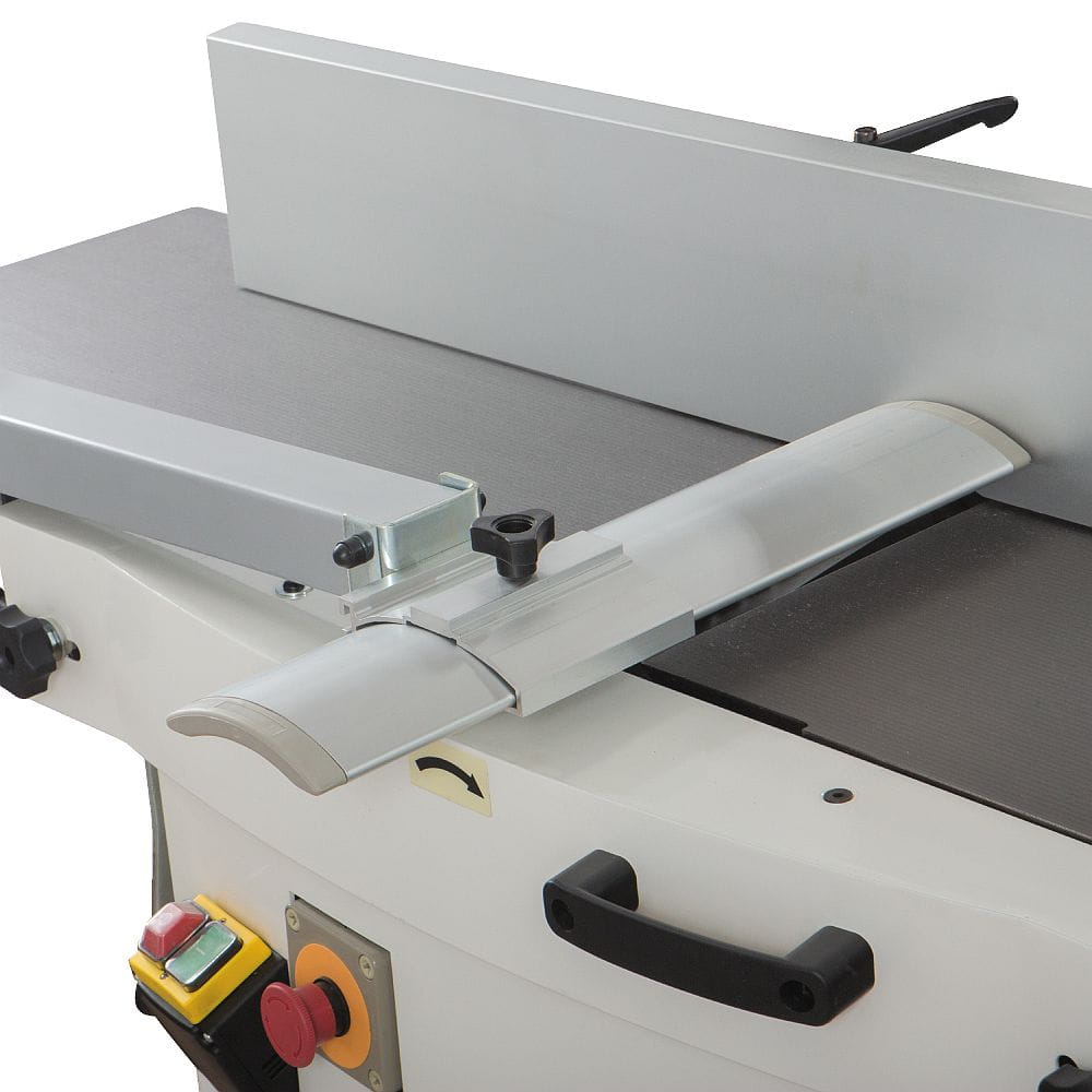 Za pomocą jednej ręki można szybko zmienić położenie żeliwnego stołu. Zmiana funkcji maszyny z wyrówniarki na grubościówkę nigdy nie była łatwiejsza. Długi stół oraz bardzo dokładna przykładnica gwarantują precyzję natomiast 3 nożowa głowica zapewnia idealnie opracowaną powierzchnię. Ustawienie wysokości stołu wejściowego za pomocą dźwigni mimośrodowej jest proste i łatwe. Za pomocą mimośrodu można również ustawić wysokość stołu wyjściowego. Dysza ssąca dzięki podłączeniu do odpowiedniego układu odciągowego utrzymuje maszynę w nienagannej czystości. Maszyna z szerokim zakresem zastosowań idealnie nadaje się do profesjonalnych warsztatów lub do pracowni majsterkowiczów.