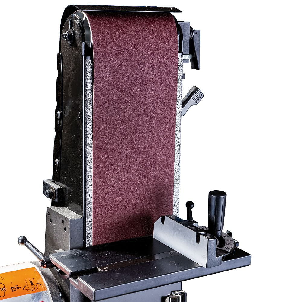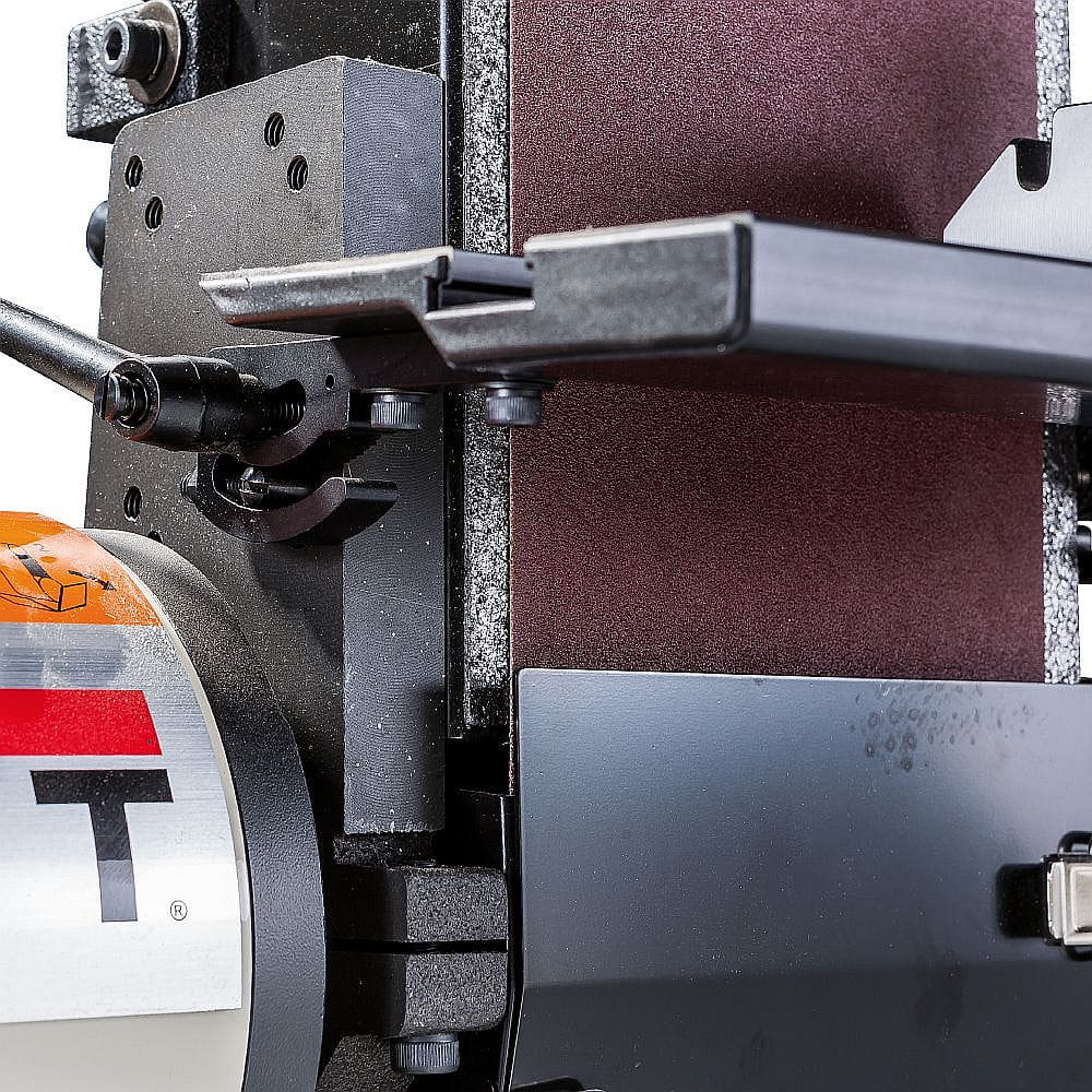 Kombinowana szlifierka ma w połowie zamkniętą tarczę szlifirską, a funkcję opory pełni doskonale szlifowany stół żeliwny, który można wychylać o 45°. Stół posiada dwa T-rowki, które idealnie nadają się do zastosowania do przykładnicy lub kłów. Zintegrowane odciąganie wyposażone jest w zasuwy, które w znacznym stopniu uskuteczniają proces odciągania. Szlifierkę można bezpośrednio przymocować do stołu roboczego lub do wybranej podstawy ze schowkiem.