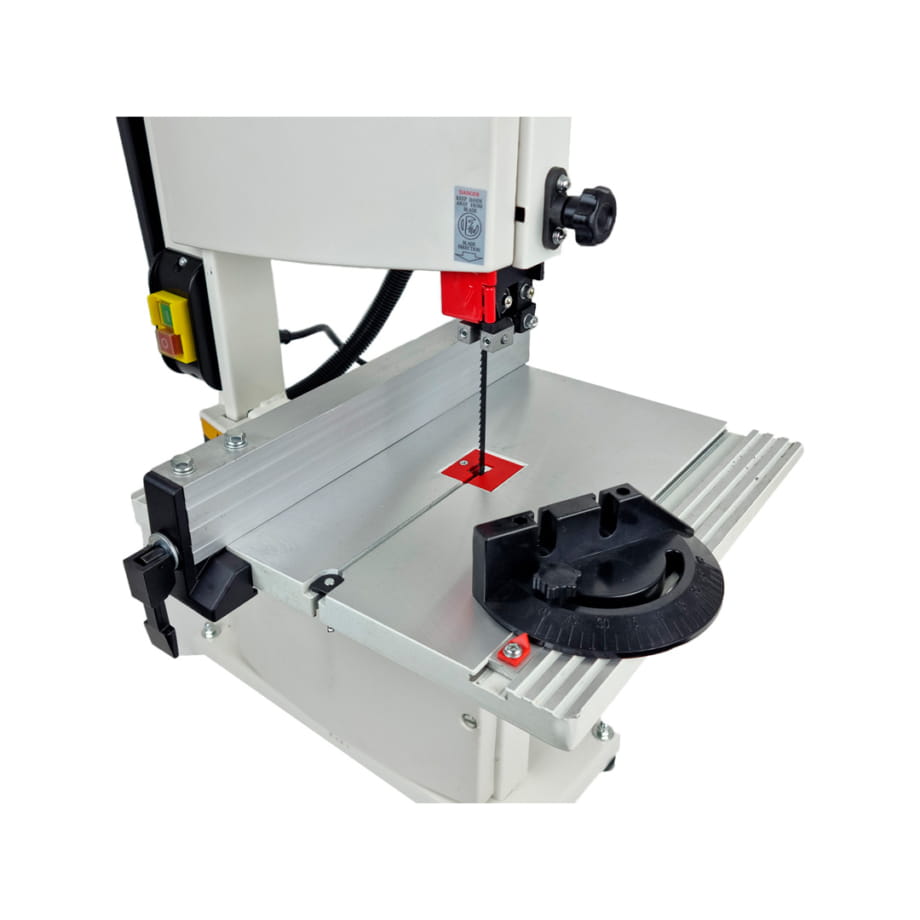 Mała pilarka taśmowa JWBS-9X to innowacyjny typ JWBS-9. Piła przeznaczona jest do cięcia wzdłużnego, poprzecznego i kształtowego cięcia drewna lub podobnych materiałów. Solidny stół z duraluminium posiadający skalę umożliwia przechylenie do 45 °. Maszyna wyposażona jest w cichy silnik indukcyjny o mocy 350 W oraz w oświetlenie obszaru roboczego. Maksymalna wysokość cięcia wynosi 80 mm. Przykładnica kątowa może być wykorzystana do cięcia materiału pod kątem +/- 60 °. Dzięki możliwości podłączenia urządzenia odciągowego można znacznie zaoszczędzisz czas stracony na oczyszczaniu. Maszyna jest łatwa w obsłudze i nie wymaga specjalnej konserwacji.