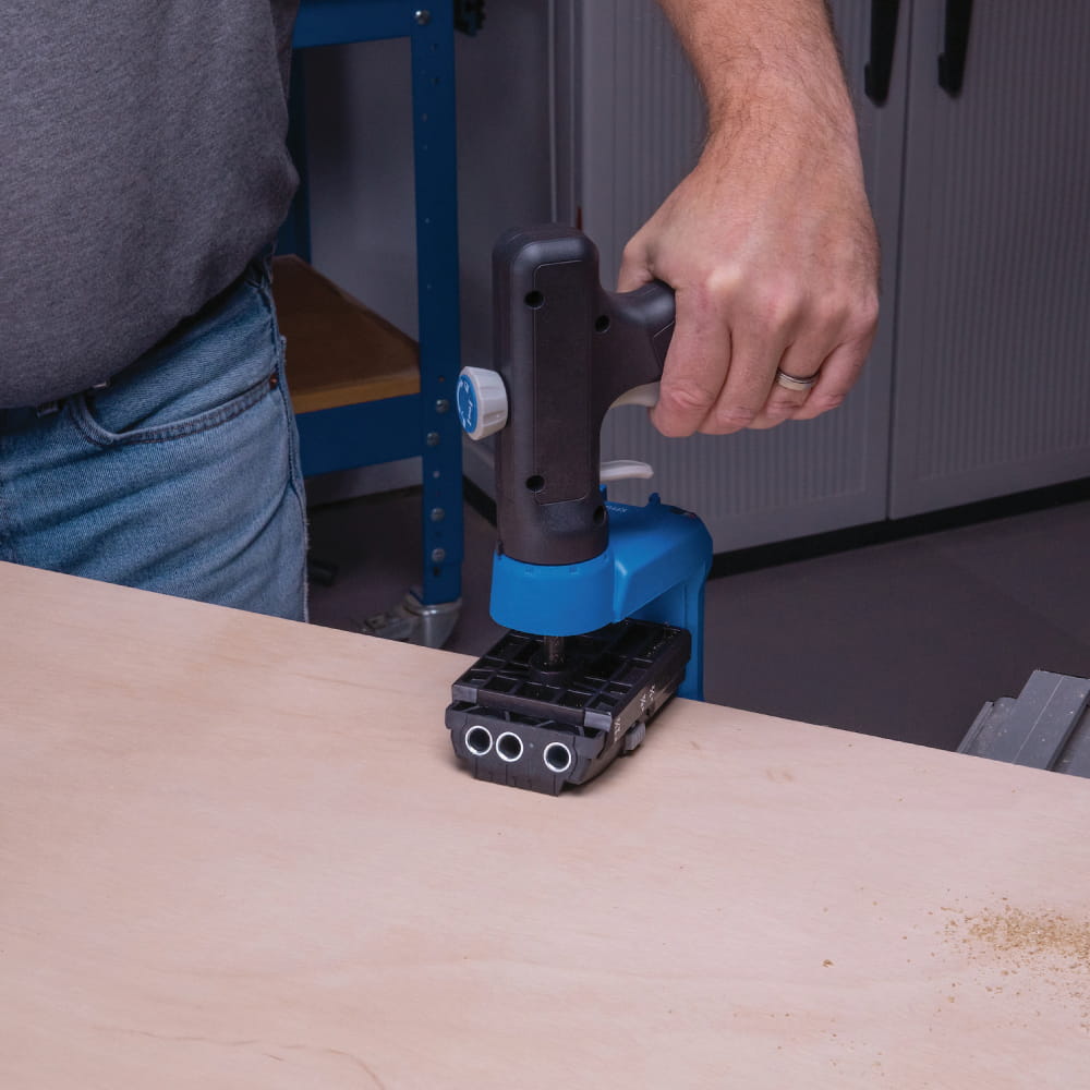 Regulowany ogranicznik głębokości zapewnia powtarzalność podczas wiercenia otworów kieszeniowych w wielu elementach o podobnej grubości. Szablon Pocket 520PRO może być używany na stole warsztatowym lub ze względu na swoją elastyczność bezpośrednio na obrabianym przedmiocie.