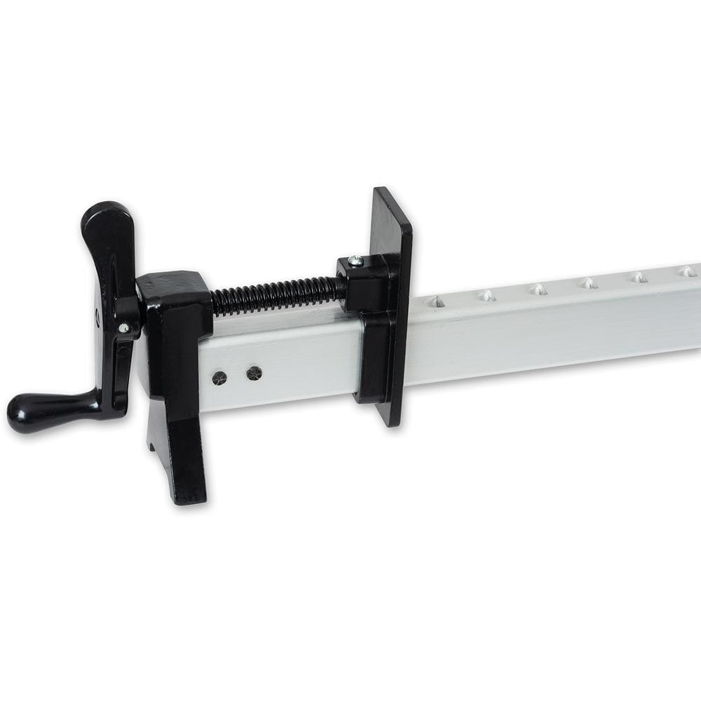 Listwy wykonano z grubego aluminium wytłaczanego o wymiarach 35 mm x 22 mm. Aluminiowe stopy zapewniają stabilność, zapobiegają przewracaniu się oraz podnoszą wysokość, ułatwiając obracanie uchwytu. Ściski są w pełni regulowane i blokują się co 25 mm. Gwintowane wrzeciona mają średnicę 12 mm z gwintem Acme, co pozwala na wywiercenie maksymalnej siły docisku.